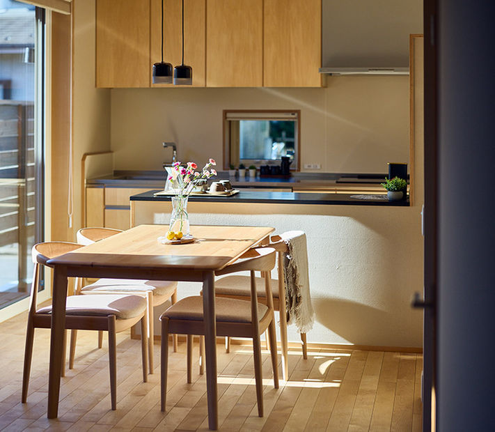 南側に大開口が設けられたLDKは冬場は心地よい日差しが部屋の奥まで入りカバザクラの床材も素足で歩きたくなるほど心地良い足触りに。夏は外の庇とトリプルガラスが日差しを抑え、2階のエアコン1台で家中を空調。