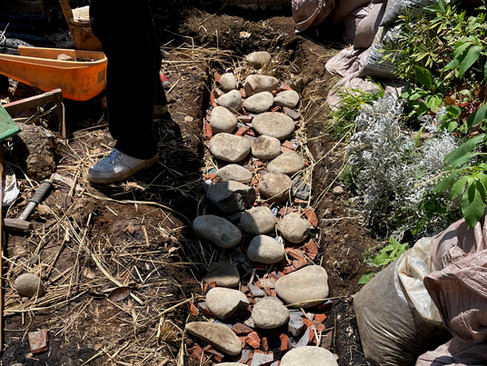雨といからの雨水を大地にろ過しながら浸透させる「雨落ち」の施工を行います。