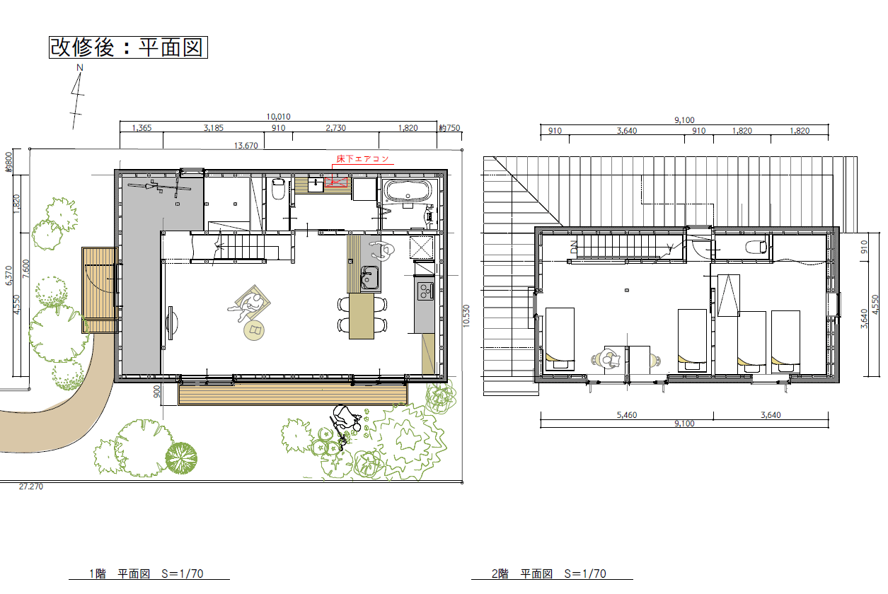住まいの温熱環境は屋根断熱と壁付加断熱で、断熱等級6相当の快適な空間に性能向上され、冬は床下エアコン1台・夏は2階の壁掛けエアコン1台+熱交換換気型一種換気で、年間通して安定した温熱環境が確保されました。