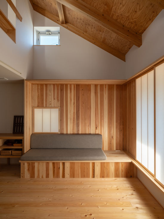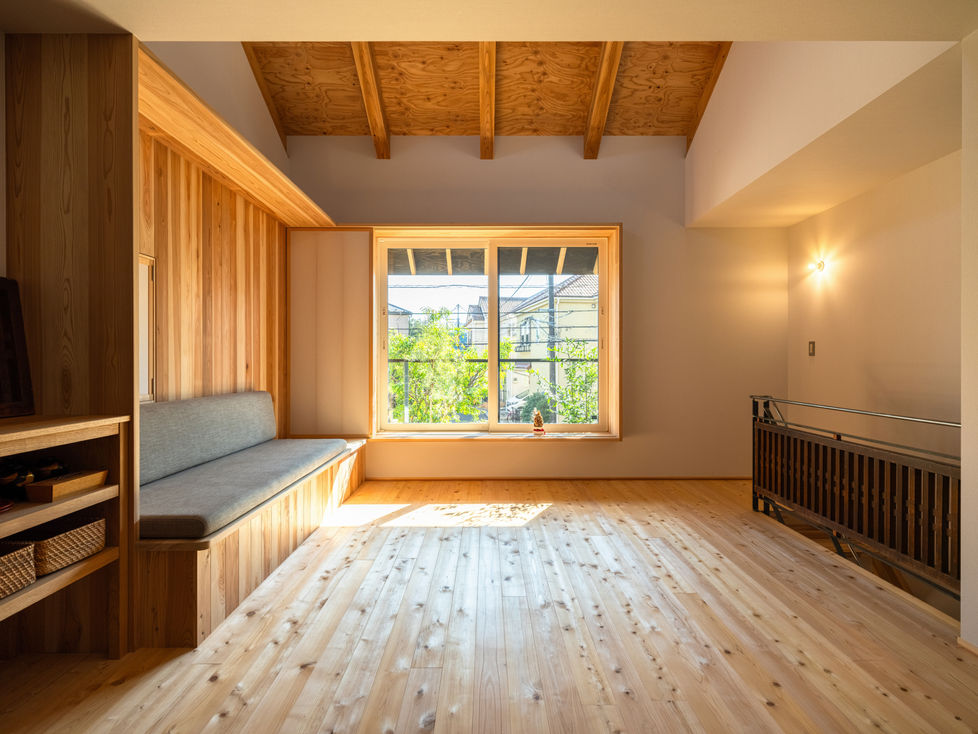 床の仕上げや家具、カーテンでなんとなく空間を分け、窓や照明、造作ベンチなどで色々な所に居場所をつくる事で、家族のプライベートを確保しながら気配を感じらます。
