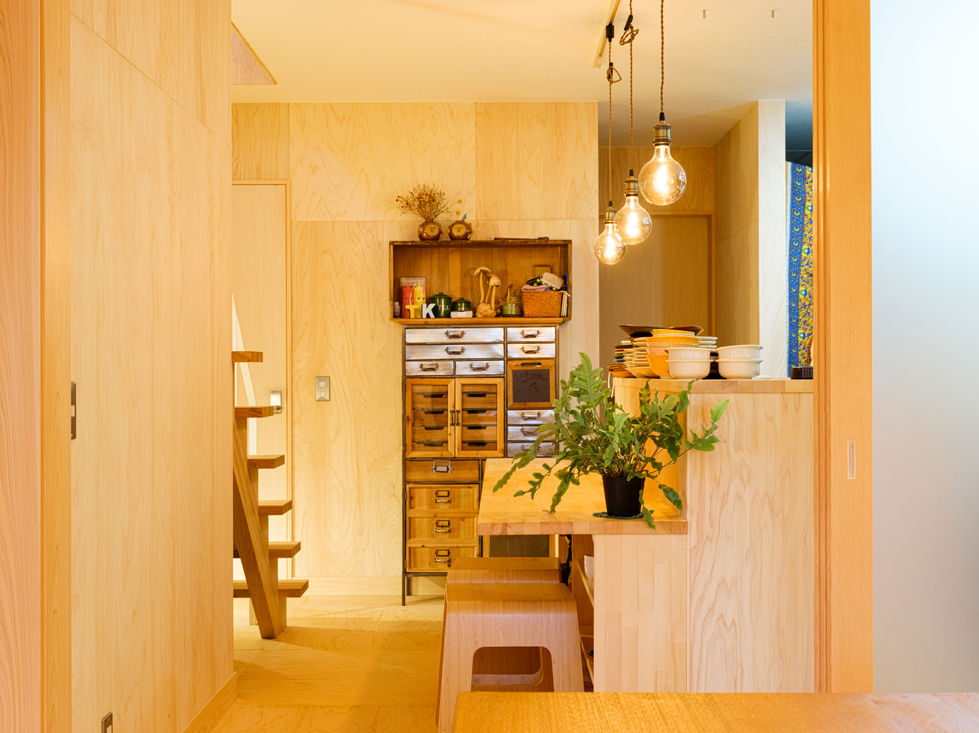 室内の壁と床は桧のインテリア合板で仕上げ、木のぬくもりと観葉植物が映える空間になりました。